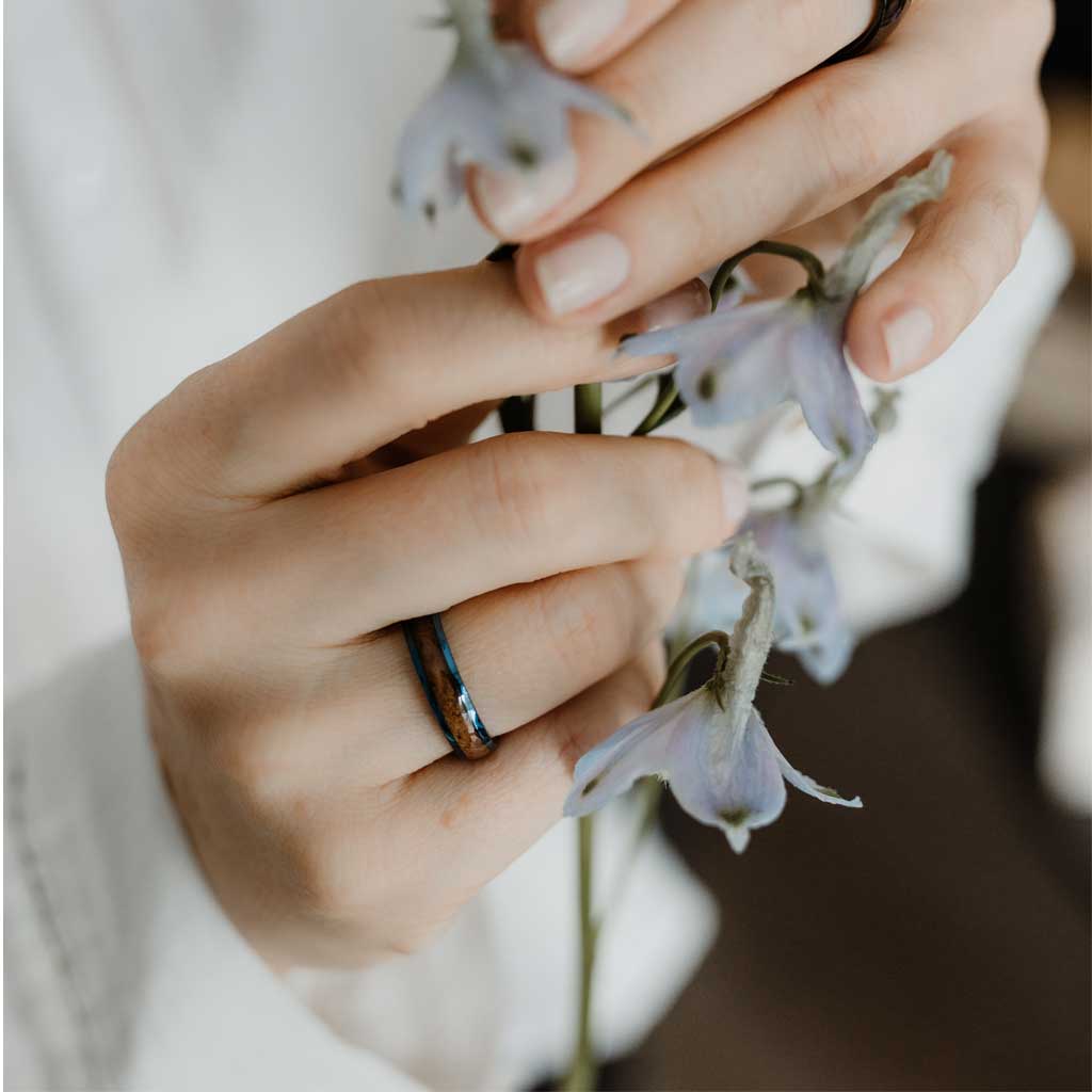 Oživte svoj štýl s naším dámskym prsteňom Harmonie v prevedení Modrá Oceľ-Orech Oceánsky Šarm. Dotyk prírodného lesku a jemnej elegance. S jemným leskom oceánskej hĺbky a jedinečnou eleganciou lesného kúzla. Tento drevený prsteň sa stáva symbolom vašej osobitosti. Každý detail tohto prstena vyžaruje ručnú prácu a pozornosť kvalifikovaných remeselníkov.